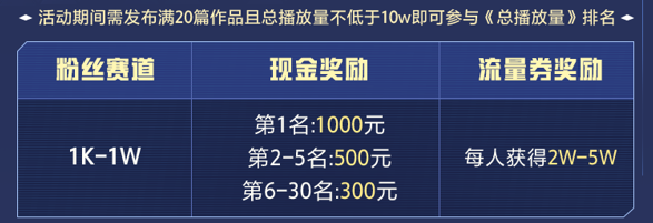 活动期间需发布20件作品且总播放量不低于10w即可参与“总播放量”排行榜
